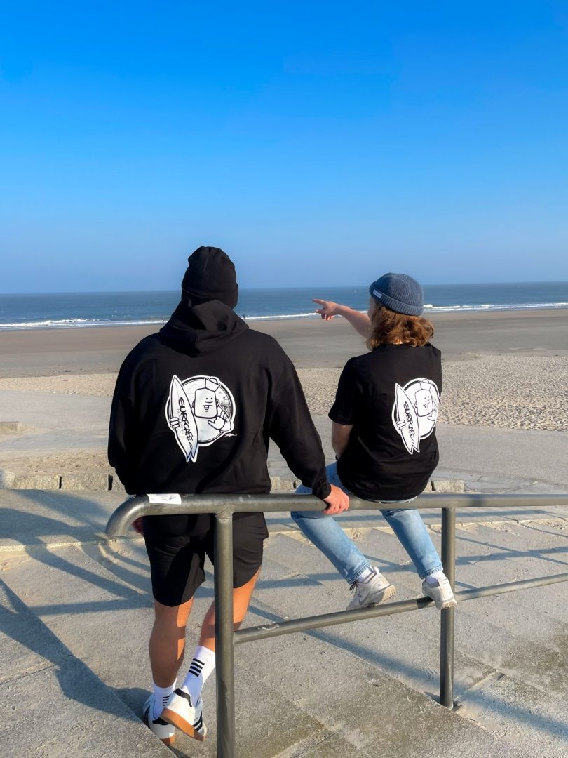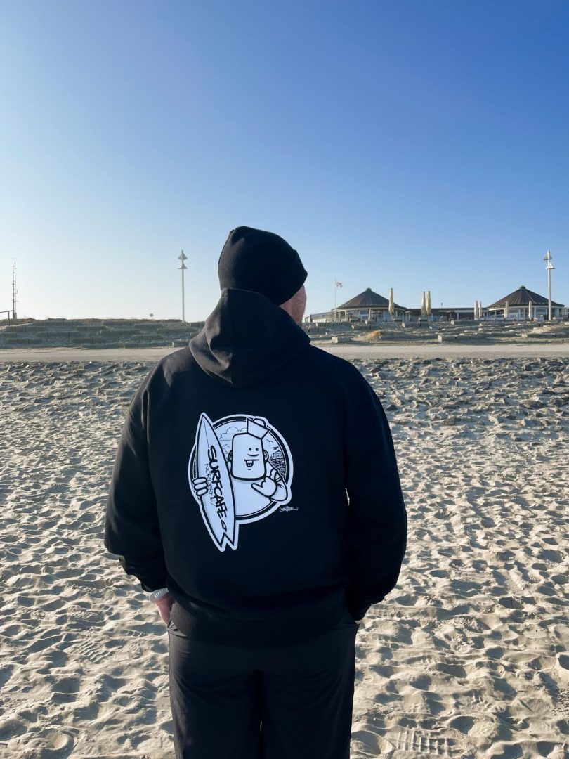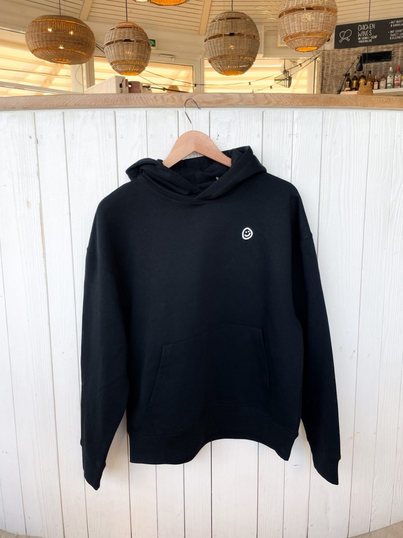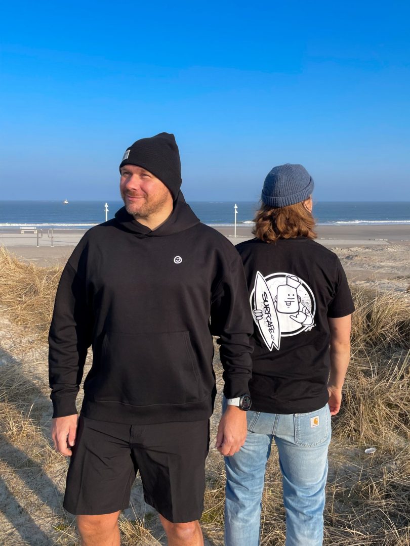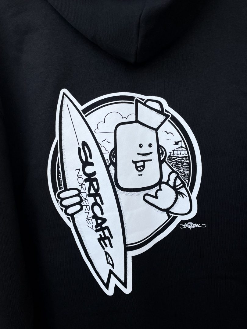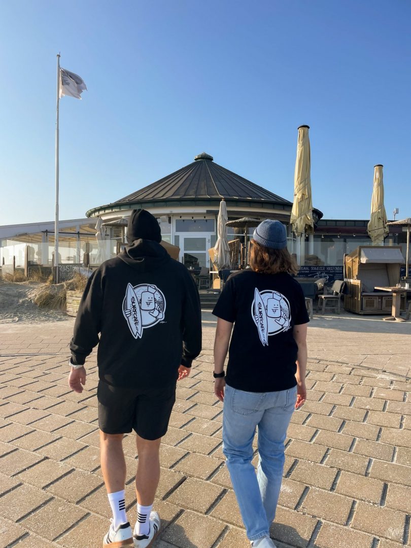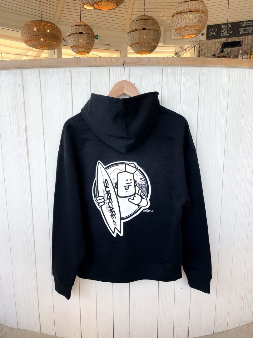 Unser „Good Vibes“-Smiley auf der Vorderseite wurde von Rebelzer entworfen und ist inzwischen ein kleines Surfcafé-Symbol geworden – ihr kennt ihn vielleicht auch von unseren Hausweinen oder den Buttons.